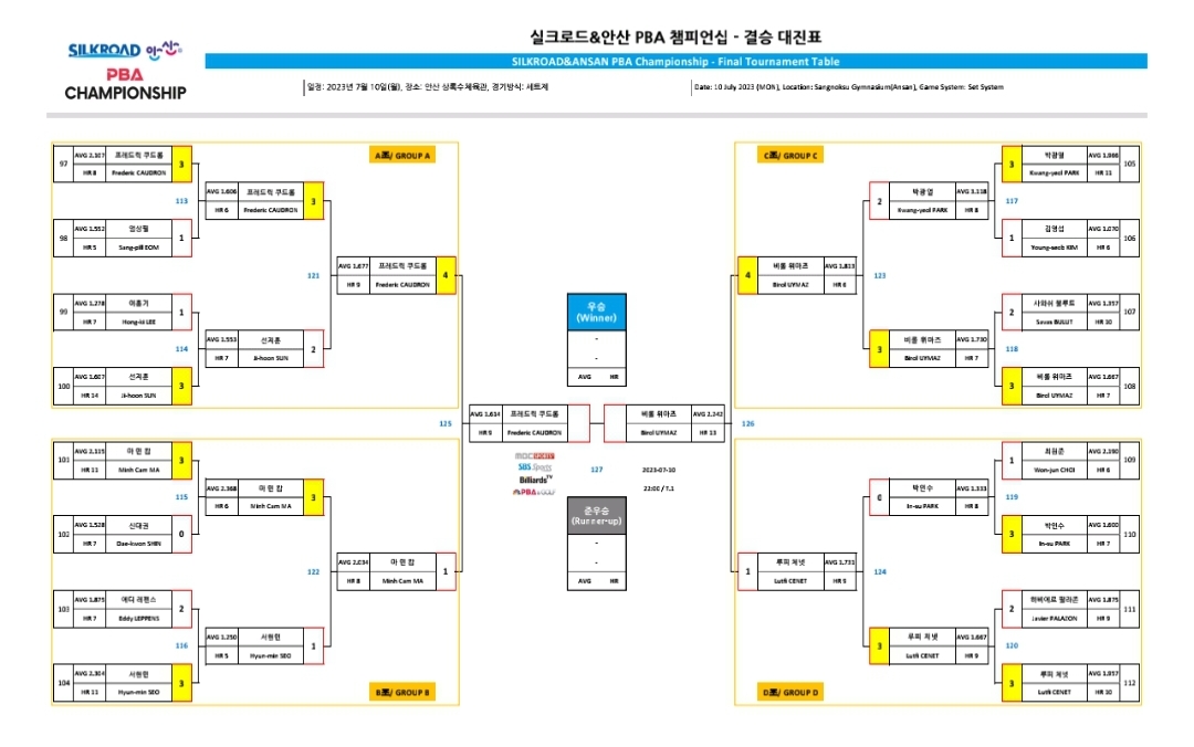 | 실크로드 안산 PBA 챔피언십 결승전 경기결과 - 우승 프레드릭 쿠드롱 준우승 비롤위마즈 (0) | 2023.07.11 |