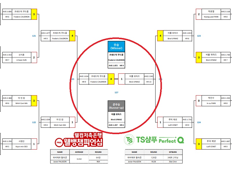 쿠드롱은 벨기에 국적의 세계 3쿠션 최강자의 면모을 다시 한 번 과시했습니다. 지난 시즌까지 일곱차례나 우승을 차지한 프레드릭 쿠드롱은 이번 우승으로 PBA투어에서 여덟번째 우승을 차지한 최초의 선수가 되었습니다.