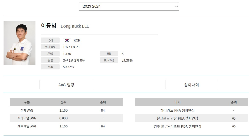 이동녘 당구 선수의 PBA 투어 경기 종합 전적 승률 정보입니다. 추후 업데이트 예정입니다.
