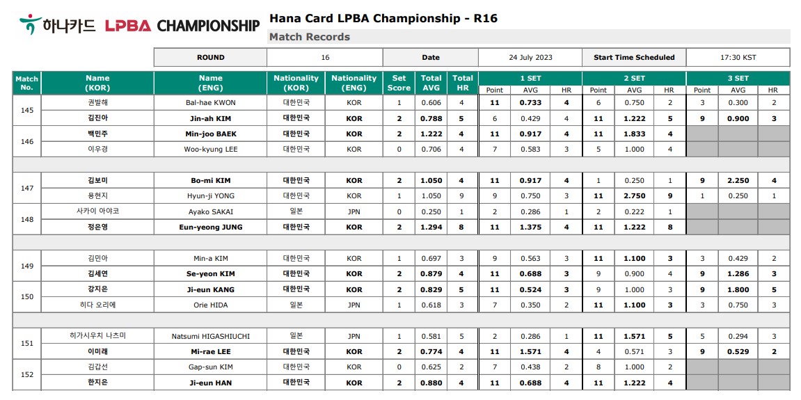 프로당구 2023-24시즌 3차 대회, 하나카드 LPBA 챔피언십 8강 대진표 16강 경기결과에 대한 정보입니다. 본 내용은 PBA 프로당구협회가 PBA 홈페이지를 통해 공지한 내용임을 밝혀 둡니다. 먼저 하나카드 LPBA 챔피언십 16강 경기결과부터 살펴보겠습니다.