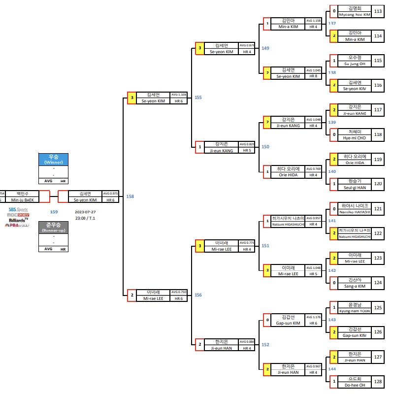 우선 조금 전에 끝난 하나카드 LPBA 챔피언십 4강 준결승전 경기결과를 살펴보고, 결승 대진표에 이름을 올린 백민주 김세연 두 선수의 우승 전망까지 두 선수의 LPBA 경기지표에 근거하여 정리해 보았습니다.