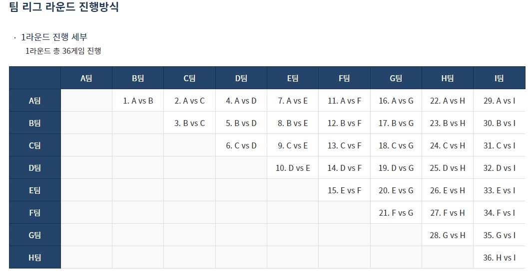 총 9개 프로 당구팀, 총 5개라운드, 1라운드 36경기