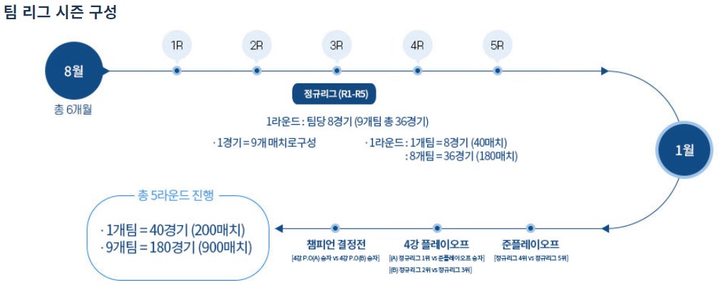 올 시즌(프로당구 2023-24시즌) PBA팀리그 시즌 구성입니다. PBA팀리그 총 5라운드로 진행되며 1라운드, 1개팀당 8개 경기가 진행됩니다. 1개 경기는 9개 매치로 구성됩니다. 9개팀이 펼치는 1개 라운드는 총 36경기로 총 180매치로 진행됩니다.