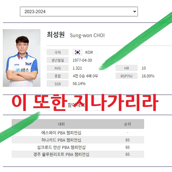 그럼 지금부터 최성원 선수의 프로당구 2023-24 시즌 PBA 투어 경기결과를 간략히 정리해 봅니다.