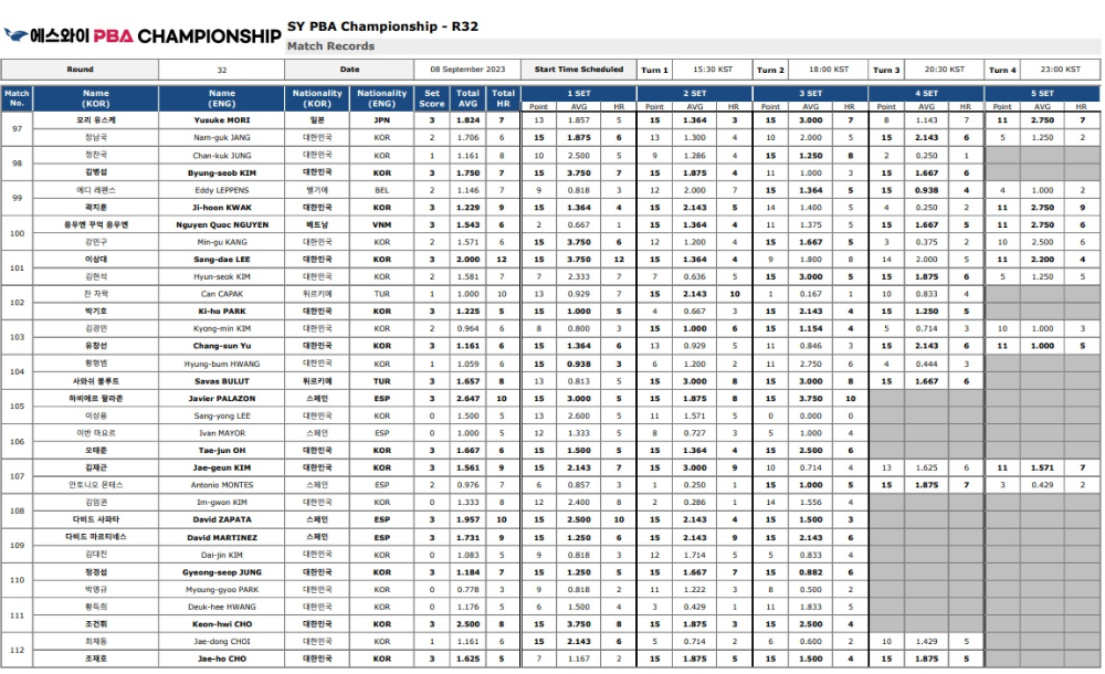 그리고 한국을 대표하는 조재호 선수가 살아 있습니다. 벨기에에의 에디 레펜스는 에스와이 PBA 챔피언십 32강에서 곽진훈 선수에게 3대 2로 패배하였습니다. 강민구는 응우옌 꾸억에게 3대 2로 졌습니다.