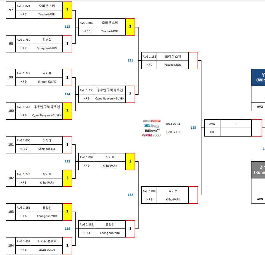 에스와이 PBA 챔피언십 4강 준결승 대진표 - 모리 유스케 VS 박기호