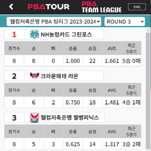 프로당구 23-24시즌 PBA 팀리그 3라운드 순위 1위는 NH농협카드 그린포스, 2위는 크라운해태 라온, 3위는 웰컴저축은행 웰뱅피닉스, 4위는 블루원 엔젤스, 5위는 하나카드 하나페이, 6위는 SK렌터카 다이렉트, 7위는 하이원 위너스, 8위는 에스와이 바자르, 9위는 휴온스 헬스케어 레전드 당구팀입니다.