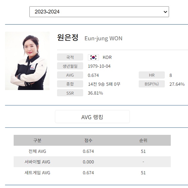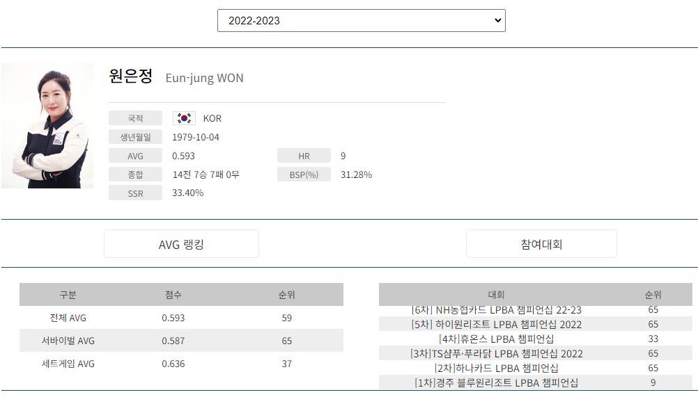 원은정 당구선수의 나이는(출생 연도) 1979년 10월생입니다. LPBA 선수가운데 19070년 출생은 김갑선, 이마리, 김경자, 히다 오리에, 김갑선 선수 정도를 꼽고 있었는데 원은정 선수가 또 있는 줄 몰랐습니다. 그만큼 당구 베테랑이라는 의미일 것입니다. LPBA 원은정 당구 선수의 매 시즌별 당구 프로필을 간략히 살펴보았습니다.