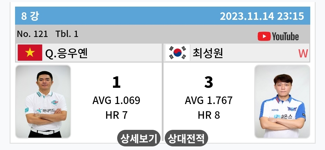 먼저 11월 14일 늦은 밤에 끝난 최성원 응우옌 꾸억 선수의 경기에 따라 확정된 NH농협카드 PBA챔피언십 8강 경기결과부터 살펴 보았습니다.