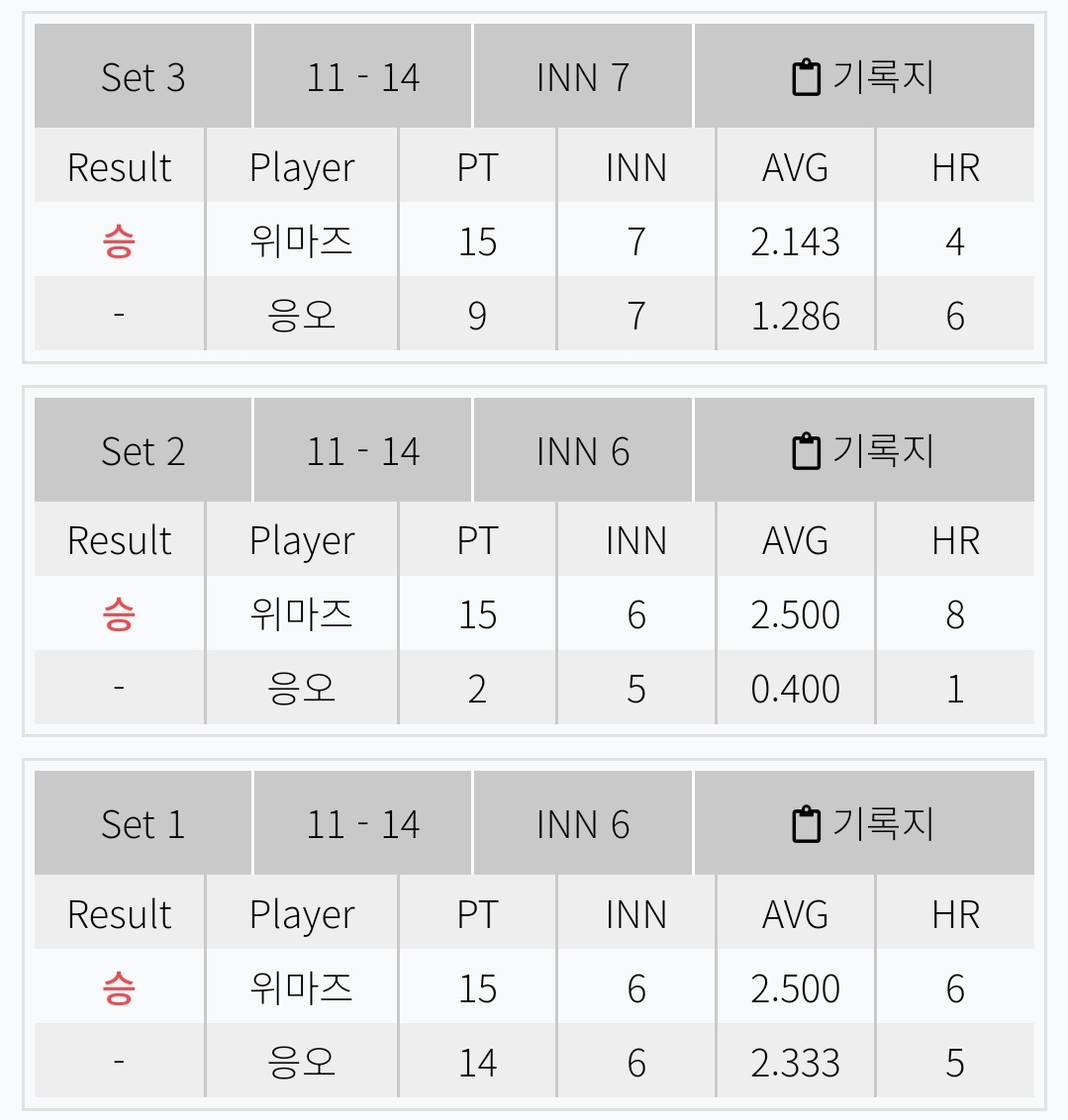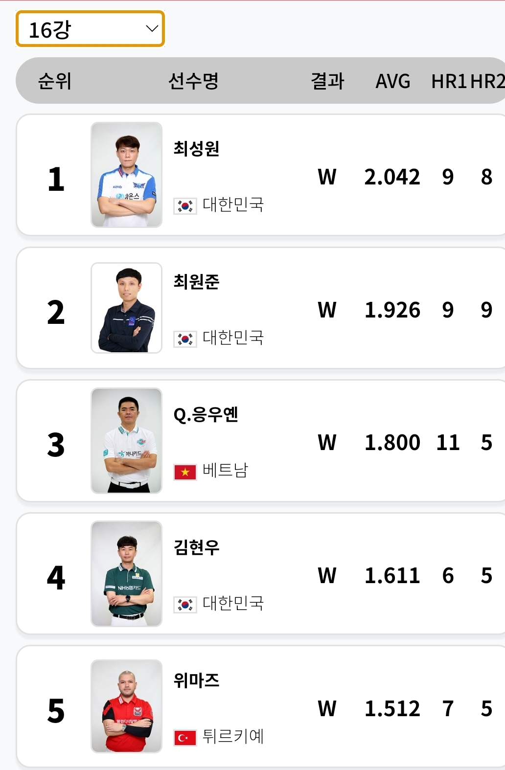 반면 16강 경기에서는 3쿠션 에버리지 2.042로 최성원 선수의 경기력이 가장 좋았습니다.