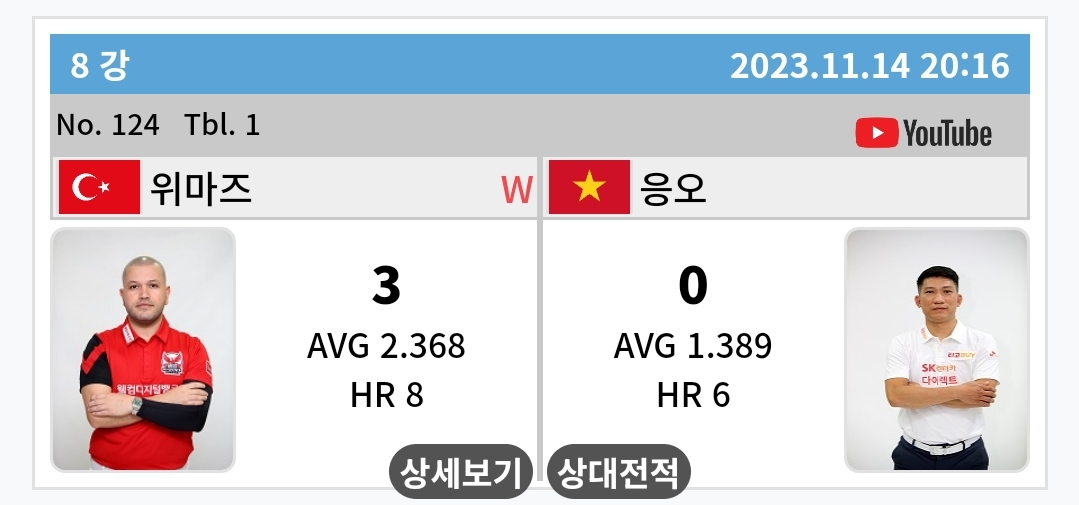 여러분은 누가 우승할 것같습니까? 8강 경기결과로는 3쿠션 에버리지 2.368로 비롤 위마즈의 경기력이 가장 좋습니다.