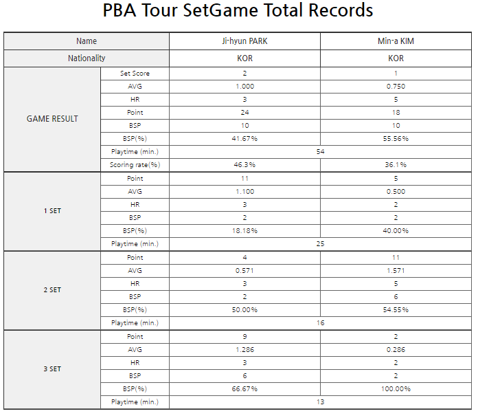하지만 박지현은 LPBA 베테랑의 경험으로 1세트, 애버리지 1.100을 기록하며 11:5로 김민아 선수를 상대로 먼저 1세트를 가져갔습니다. 하지만 김민아 선수는 2세트에 바로 반격에 나서면서 11:4로 이기면서 승부를 원점으로 돌렸습니다.