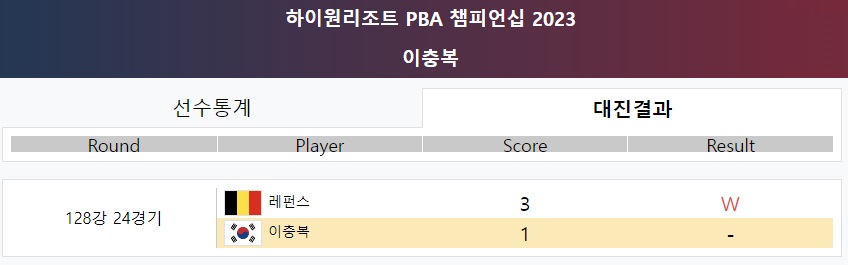 이충복 당구선수의 PBA투어 개인전 128강 1승 도전 7차 대회는 프로당구 2023-24 시즌 하이원리조트 PBA 챔피언십이었습니다. 이충복 선수의 경기 상대는 PBA챔피언십 우승 경험이 있는 벨기에 국적의 에디 레펜스 당구선수였습니다.