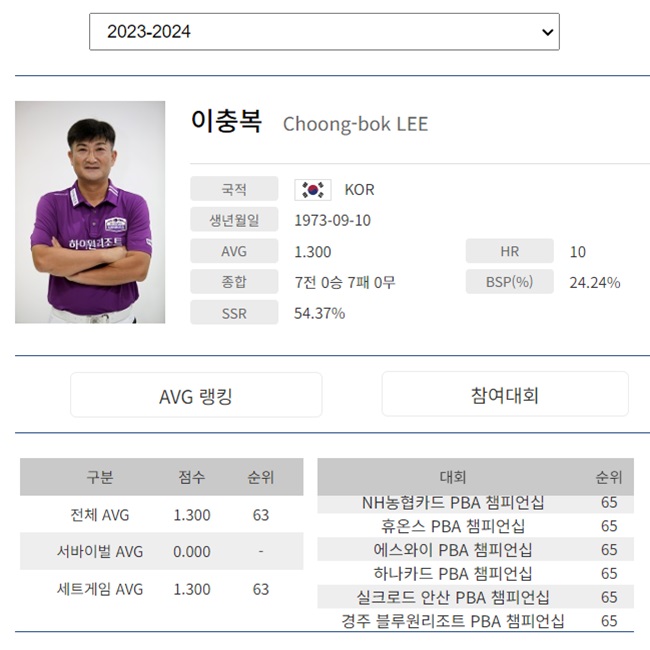 하지만 이충복 선수는 1차 대회에 이어 7차 대회까지 7연속으로 PBA 투어 128강 첫 경기에서 탈락하였습니다. PBA 프로당구 무대의 벽이 너무 높다고 설명하기에는 무언가 부족합니다. 일곱번의 대회에서 128강 예선전 탈락으로 7전 0승 7패라니 믿기지가 않습니다.