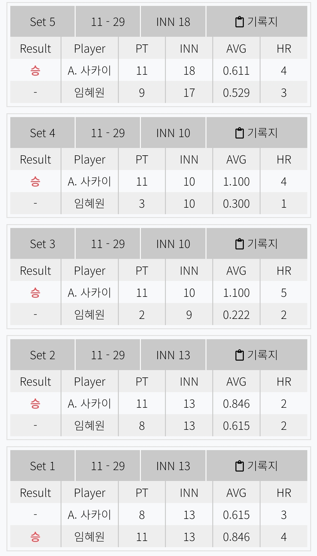 반면 임혜원 선수는 32강전에서 애버리지 1.222를 기록하였으나 16강에서 준결승전까지는 0.7대의 애버리지를 기록하였습니다.