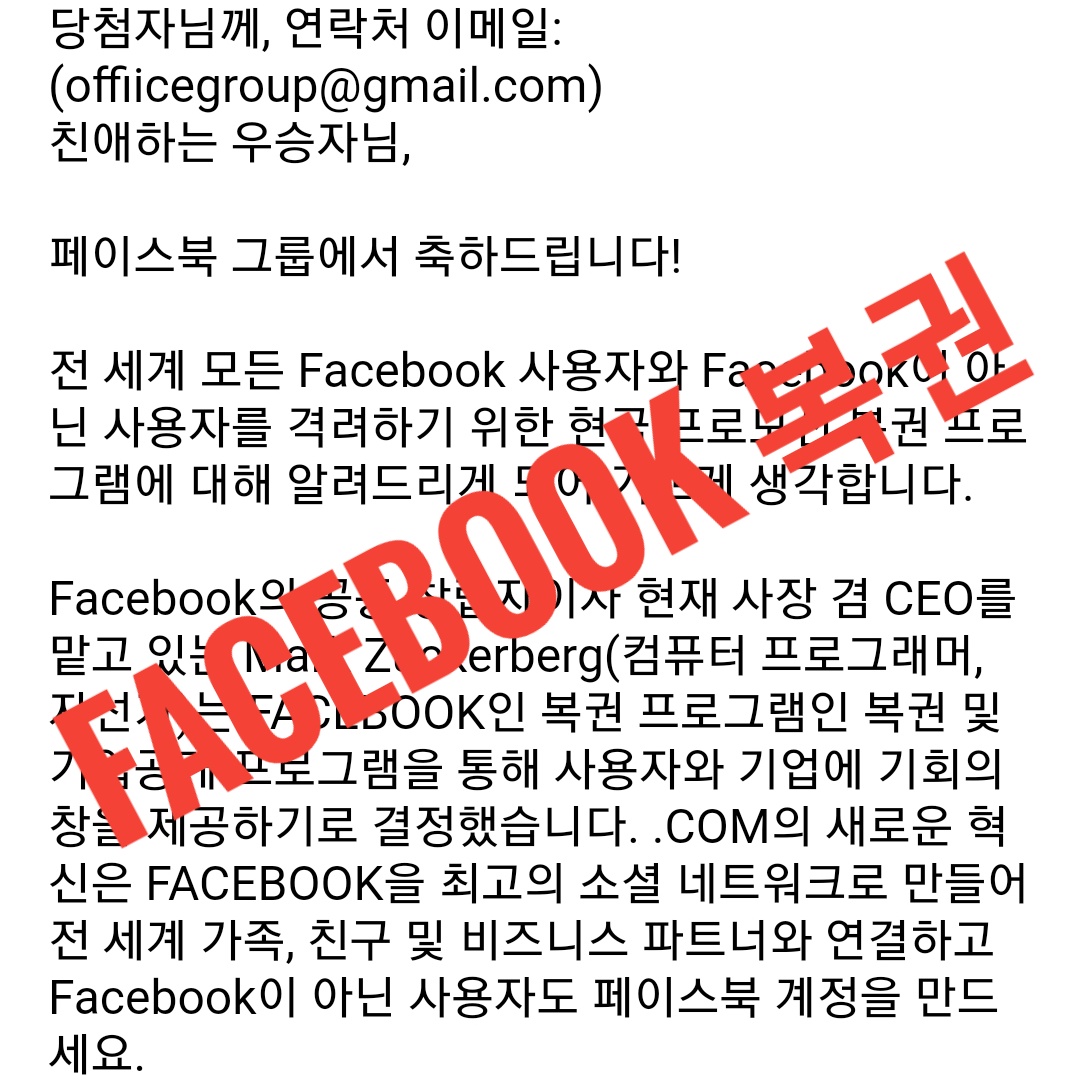 아래는 페이스북 그룹 복권 당첨을 알리는 축하메일 전문입니다. 속지 마시기 바랍니다.