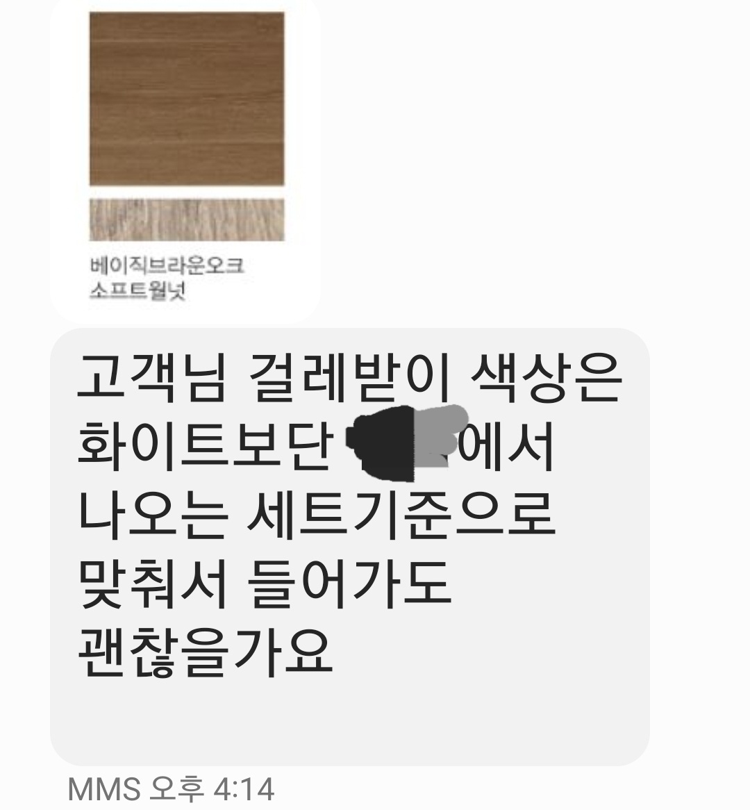 가족이 함께 현장에서 선택한 마루 색상을 걸레받이 색상 조합 선택과정에서 바꾼다는 것은 너무 위험하게 생각되어 인테리어 실장이 추천해준 첫번째 안을 선택하고 문자를 보내었습니다. "위에 맨처음 보내주신 조합 (베이직브라운오크 마루에 소프트윌넛 걸레받이)로 하겠습니다."