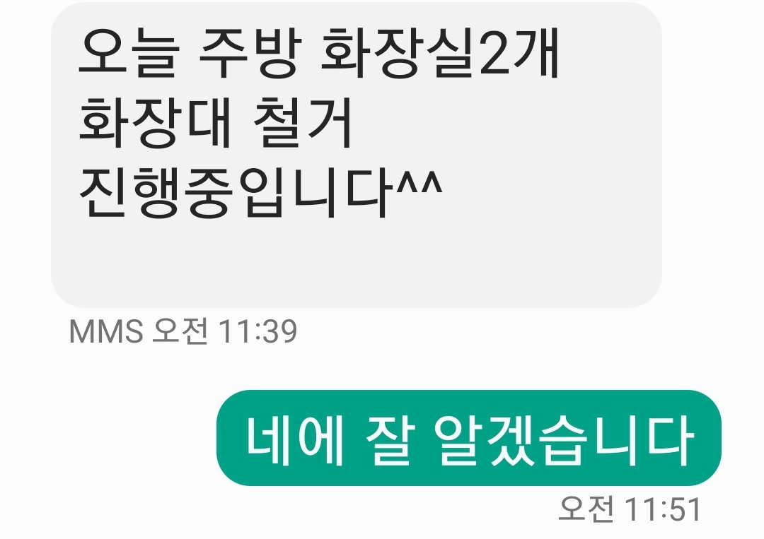 딩동! 오전 11시 조금 넘어서 H사 실장님 메시지와 사진이 함께 도착했습니다. "오늘 주방과 화장실 2개, 안방 화장대 철거 진행중입니다." "네에 잘 알겠습니다."