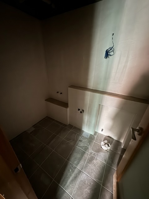 안방욕실 작업상태입니다. 벽면 타일은 밝은 색상으로 바닥 타일은 벽면대비 조금 어두운 톤을 선택했습니다. 안방 욕실 또한 타일작업만 완료되고 욕실 기기나 전기시공은 미시공상태입니다.