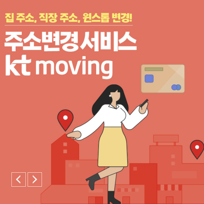 KT무빙 주소변경 서비스는 이사나 전직 등으로 인해 주소 정보가 변경되었을 때 전화번호 및 주소 등의 정보 변동 사항을 일일히 카드사나 통신사등에 연락하면서 변경신청을 하지 않아도 되는 편리한 서비습니다.