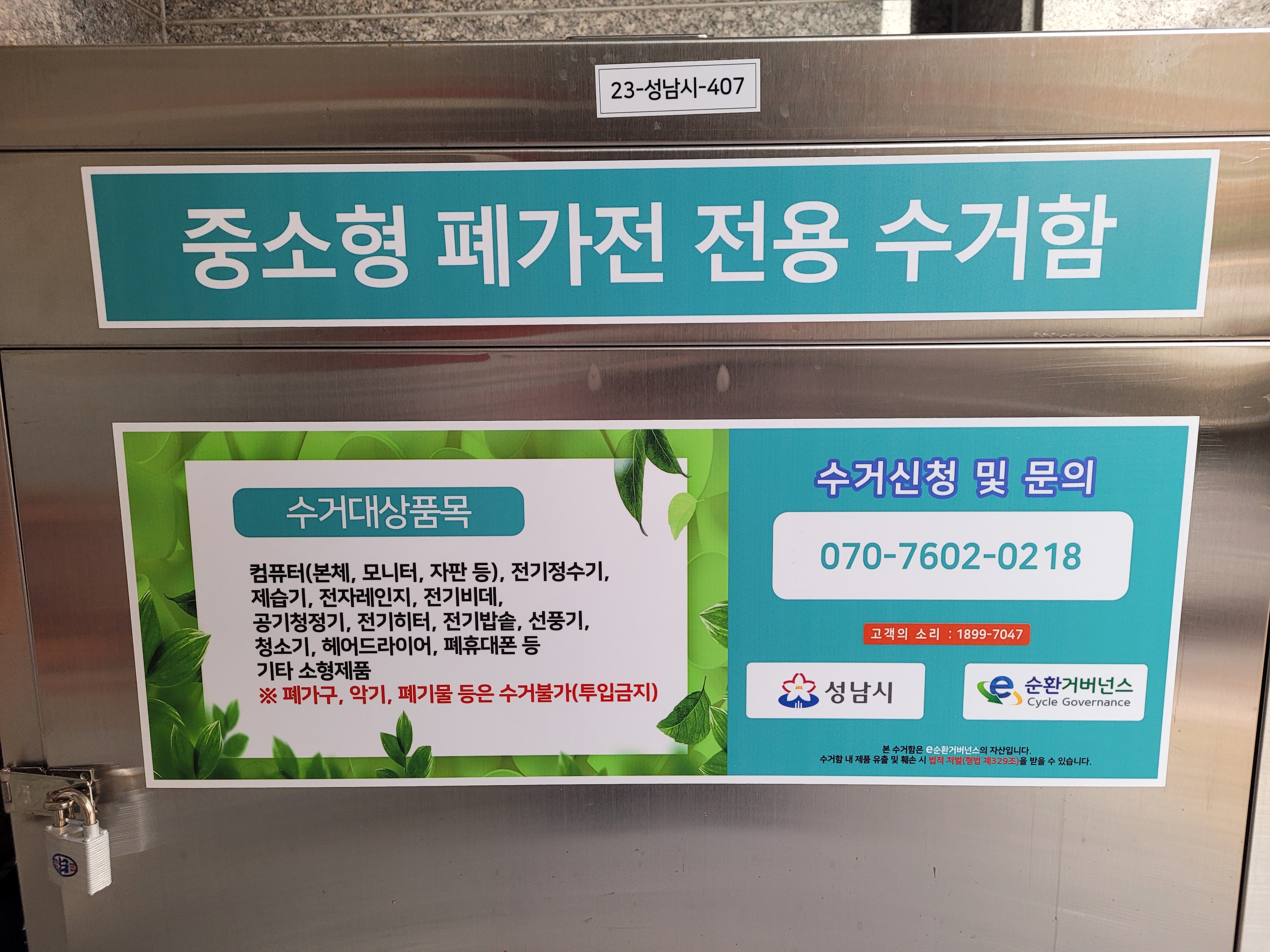 경기도 성남시 소재 아파트의 중소폐가전 배출방법 사례입니다. 아파트 관리실 입구에 비치되어 있는 중소형폐가전 수거함에 넣었습니다.