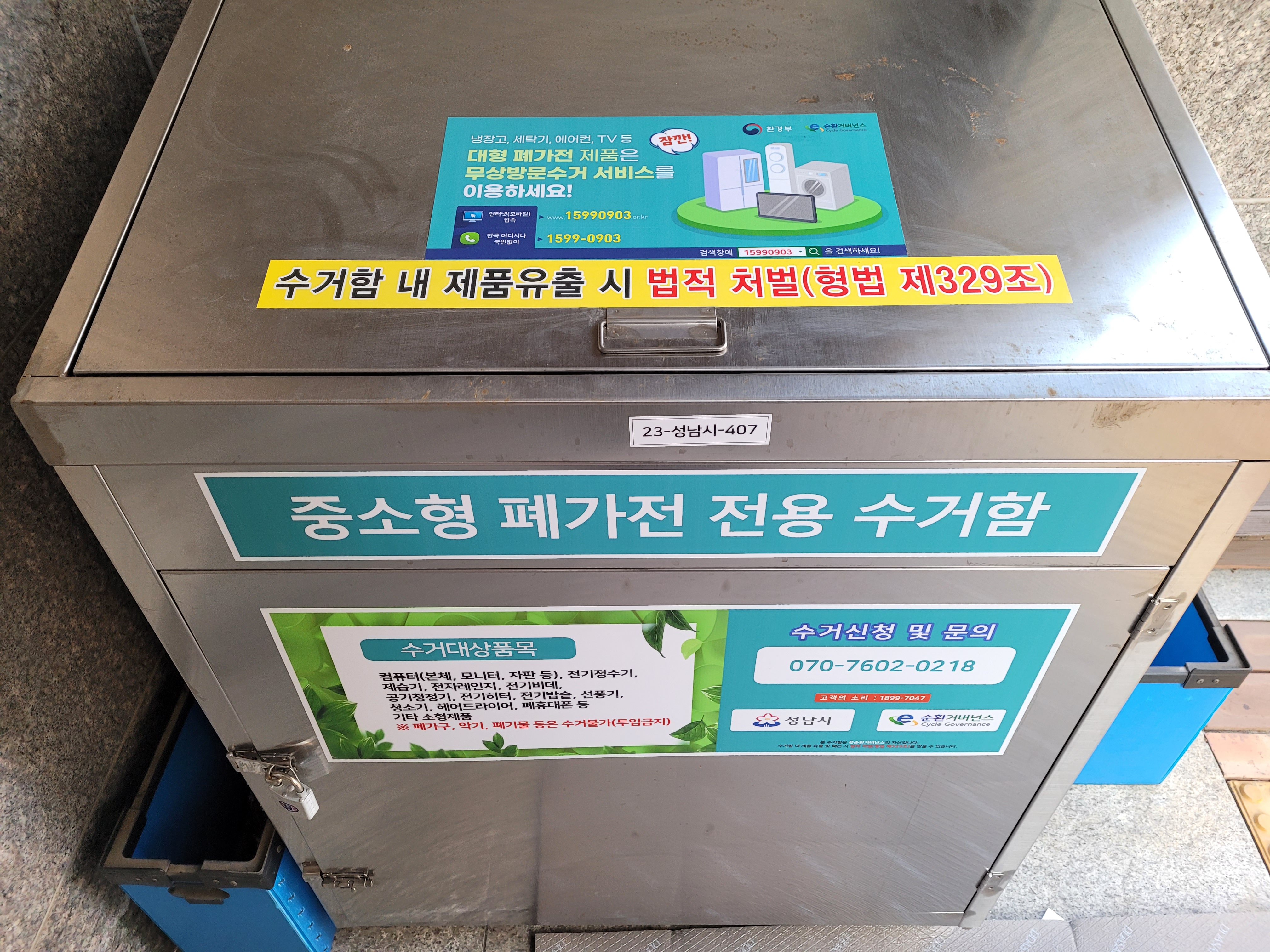 중소형 폐가전 수거함에 부착된 안내판을 보니, 이 수거함은 지자체인 성남시에서 설치하였습니다. 그리고 수거함 내 제품을 유출하거나 훼손 하는 경우에는 법적 처벌(형법 제329조)을 받을 수 있다는 경고문구가 쓰여있습니다.