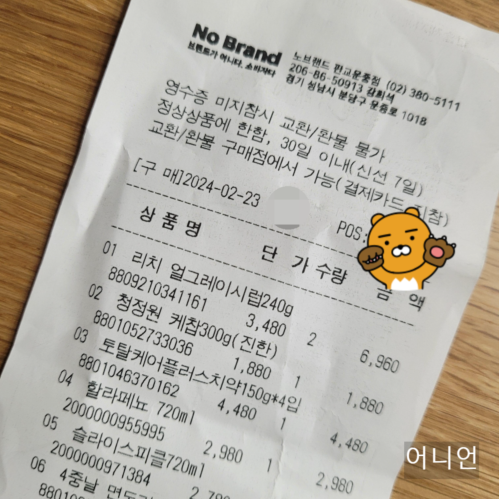 노브랜드 장바구니 물가 상품 영수증 공개 (24.2.23, 경기도 성남시)