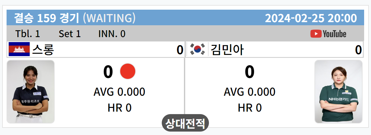 객관적 전력에서는 우승경험이 많은 스롱피아비가 앞서 있지만, 지난 프로당구 2022-23 시즌에 결승에서 만난 적이 있는 두 선수는 그 당시 김민아가 스롱 피아비를 꺾으면서 우승을 차지한 바 있습니다.