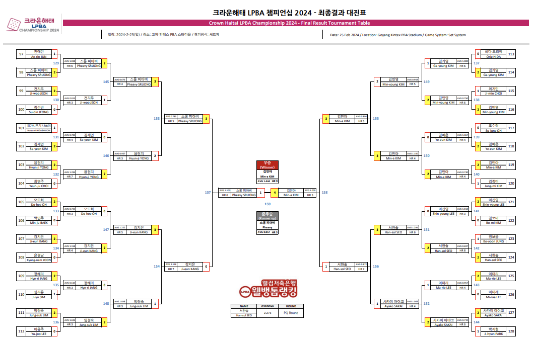 | 크라운해태 LPBA 챔피언십 2024 우승자는? 결승 대진표 4강 경기결과 (0) | 2024.02.25 |