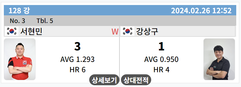 크라운해태 PBA챔피언십 2024 대회 128강 경기 서현민 PBA 챔피언의 상대 선수는 강상구 해설위원 겸 선수였습니다. 서현민 선수는 강상구를 상대로 3대 1로 승리하였습니다. 당구 게임 에버리지 1.293으로 41이닝 만에 53 득점을 기록하였습니다. 1 득점짜리 53개, 뱅크샷은 4개를 쳤으며, 공타율 43.7%, 장타율 9.8%를 기록하였습니다.