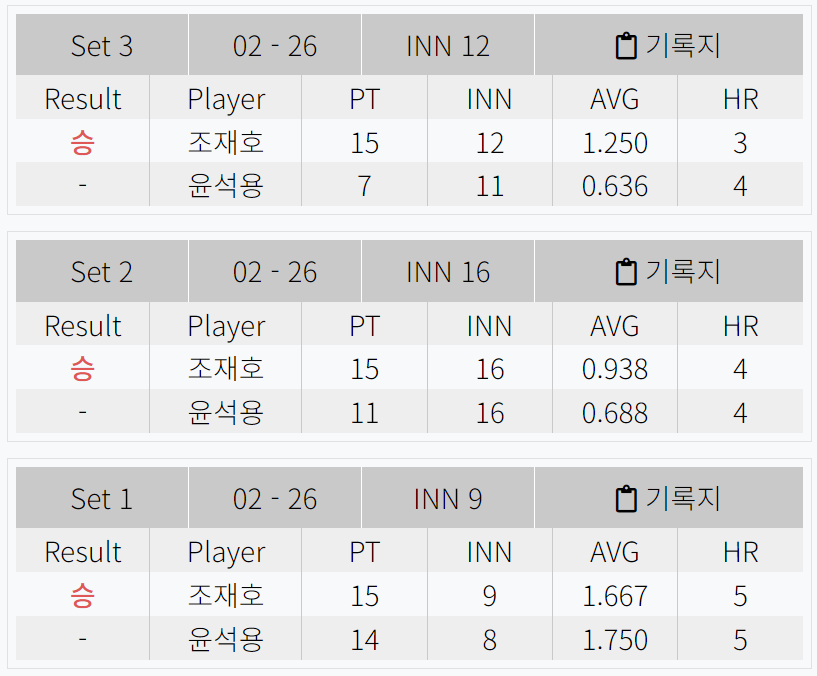 조재호 선수의 세트별 득점 현황을 보면. 1세트는 고전을 했습니다. 운석용 선수의 에버가 더 앞섭니다. 15:14로 간신히 승리하였습니다. 2세트 15:11로 이겼지만 에버리지는 1.0 이하를 찍었습니다. 3세트는 15:7로 잘 마무리 하였습니다.