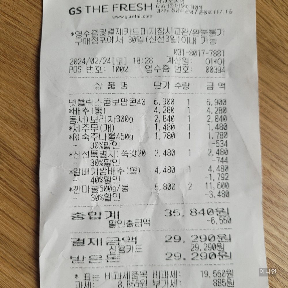 오늘 장 본  GS더프레시 장보기 결제 금액은 합계 29,290원입니다. 자세한 사항은 내돈내산 GS더프레시 영수증 참고바랍니다. 장본 날짜는 2024. 2. 24일입니다.