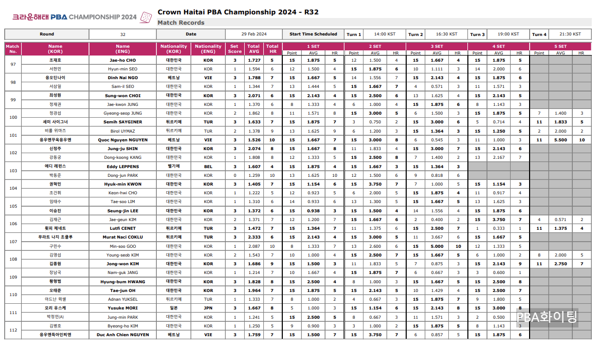 (국영문) 크라운해태 PBA 챔피언십 2024 - 32강 경기결과표