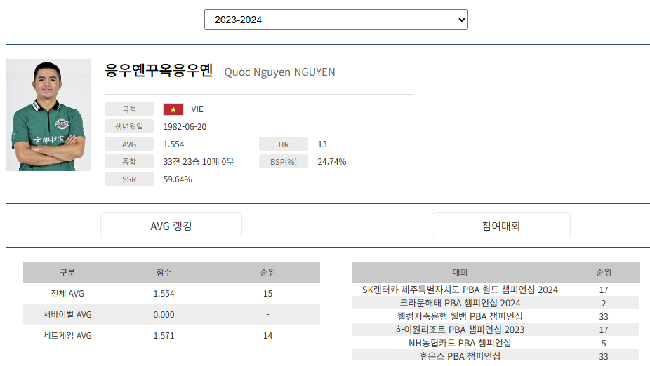 응우옌 꾸옥 응우옌은 PBA팀리그 경기에서 경기 시작전에 자주 명상을 하는 모습을 보여줄 정도로 경기에 대한 집중력이 뛰어납니다. 하지만 경기가 끝나고 나면 개구쟁이와 같은 표정으로 팬들에게 친근감을 보여주는 인기 당구선수입니다. 아래는 프로당구 각 시즌별 황형범 당구선수의 당구통계를 나타내는 당구 프로필입니다.