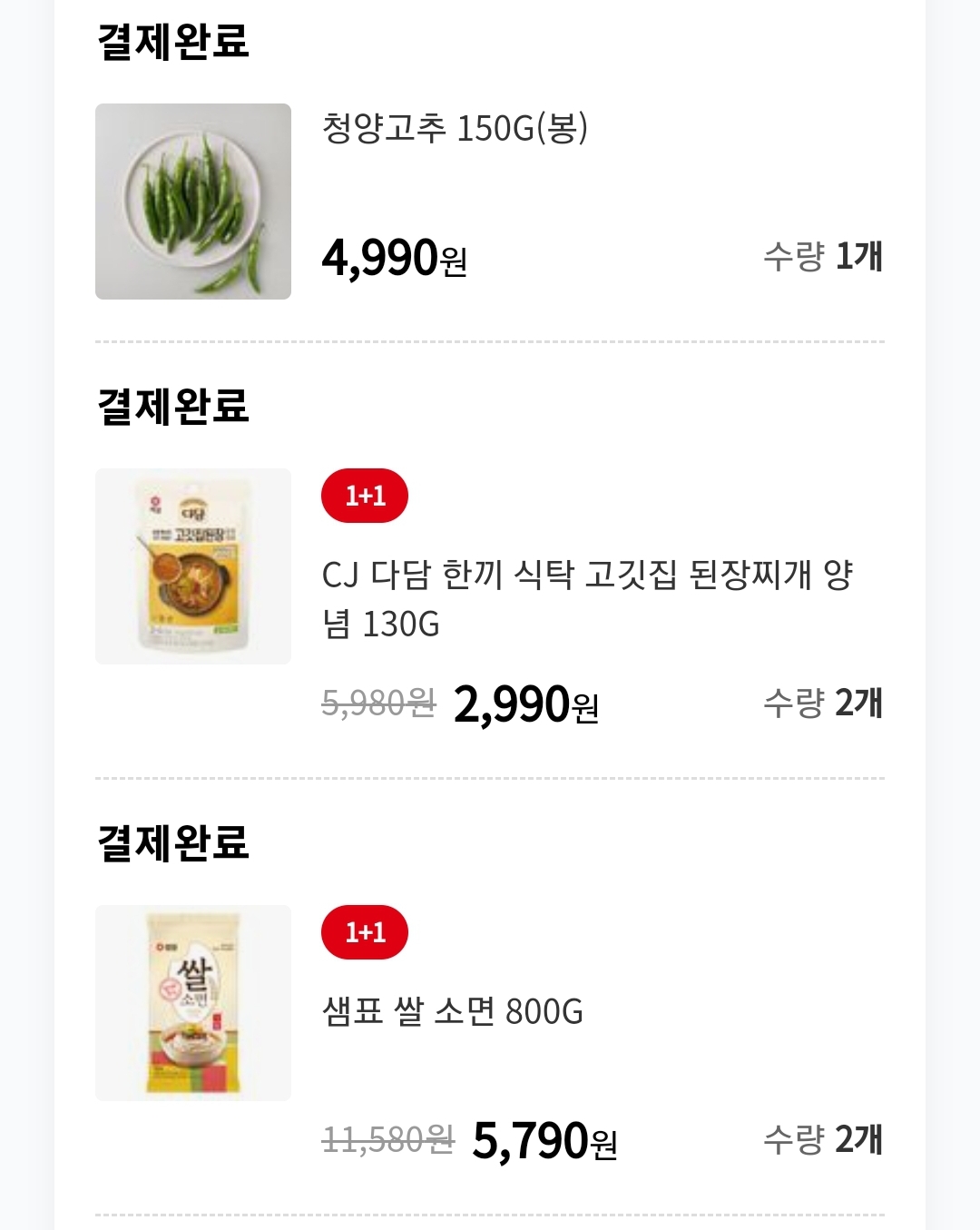 홈플러스 청양고추, 된장찌게 양념, 샘표 쌀 소면 각각 1개씩 구매했습니다. 쌀소면은 2개 구매했습니다. 쌀 소면 원플러스 원과 청양고추 한 봉 가격이 비슷합니다.