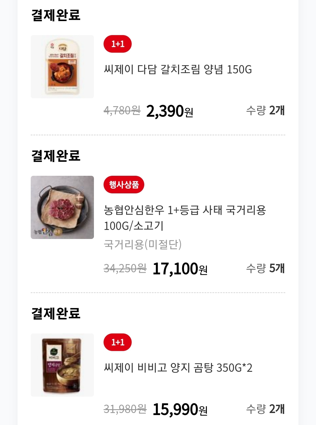 홈플러스에서 갈치조림 양념, 국거리용 한우, 비기고 양지 곰탕을 각각 1개씩 구매했습니다.
