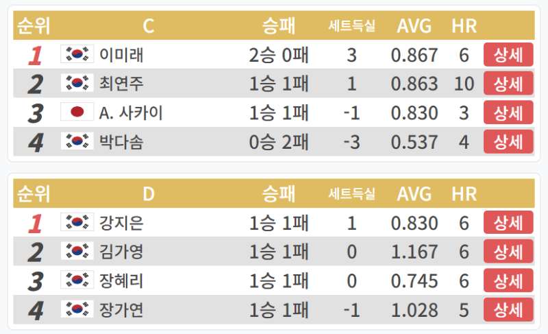 LPBA월드 챔피언십 32강 2일차 C조 경기결과입니다. C조에서는 2승을 기록한 이미래가 1위, 1승 1패를 기록한 최연주와 사카이 아야코가 나란히 2위와 3위를 기록하고 있습니다. 반면 2패을 기록한 박다솜 선수가 4위를 기록하였습니다.