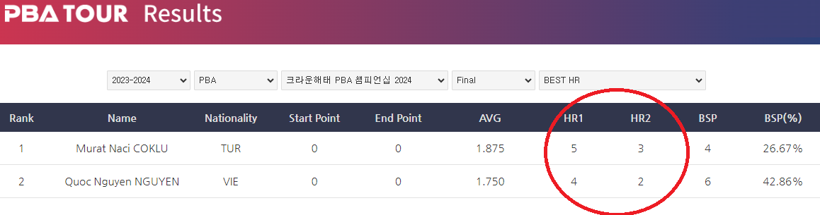 두 선수의 하이런을 보면, 우승을 한 초클루는 5점 베스트 하이런을 기록했으며, 응우옌 선수는 4점 베스트 하이런(Best HR)을 기록하였습니다. 7세트 경기에서 이 정도 하이런이 나왔다면 매우 낮았다고 할 수 있습니다. 통상 프로당구 선수들은 컨디션이 좋을 때 7점 ~ 11점 수준의 하이런을 기록하는 경우가 많습니다.