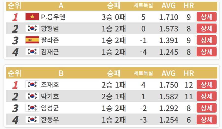 3월 12일 펼쳐진 PBA 월드챔피언십 32강 3일차 A조, B조 경기결과입니다. A조에서는 3승을 기록한 응우옌 프엉린이 1위, 1승 2패를 기록한 황형범이 2위를 기록하였습니다. 반면 1승 2패를 기록한 팔라존과 김재근은 세트득실에서 뒤지면서 3위와 4위로 밀려났습니다.