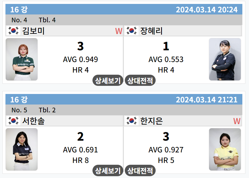 3월 14일 펼쳐진 여자 3쿠션 프로당구 왕중왕전 16강 경기결과입니다.