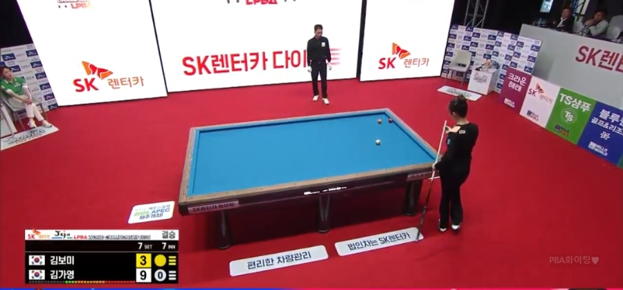 마지막 7세트는 김가영이 승리했던 1세트처럼 김가영에게 유리하게 술술 풀렸습니다. 2점을 남긴 상황에서 2득점 뱅크샷 기회를 놓치지 않았습니다.
