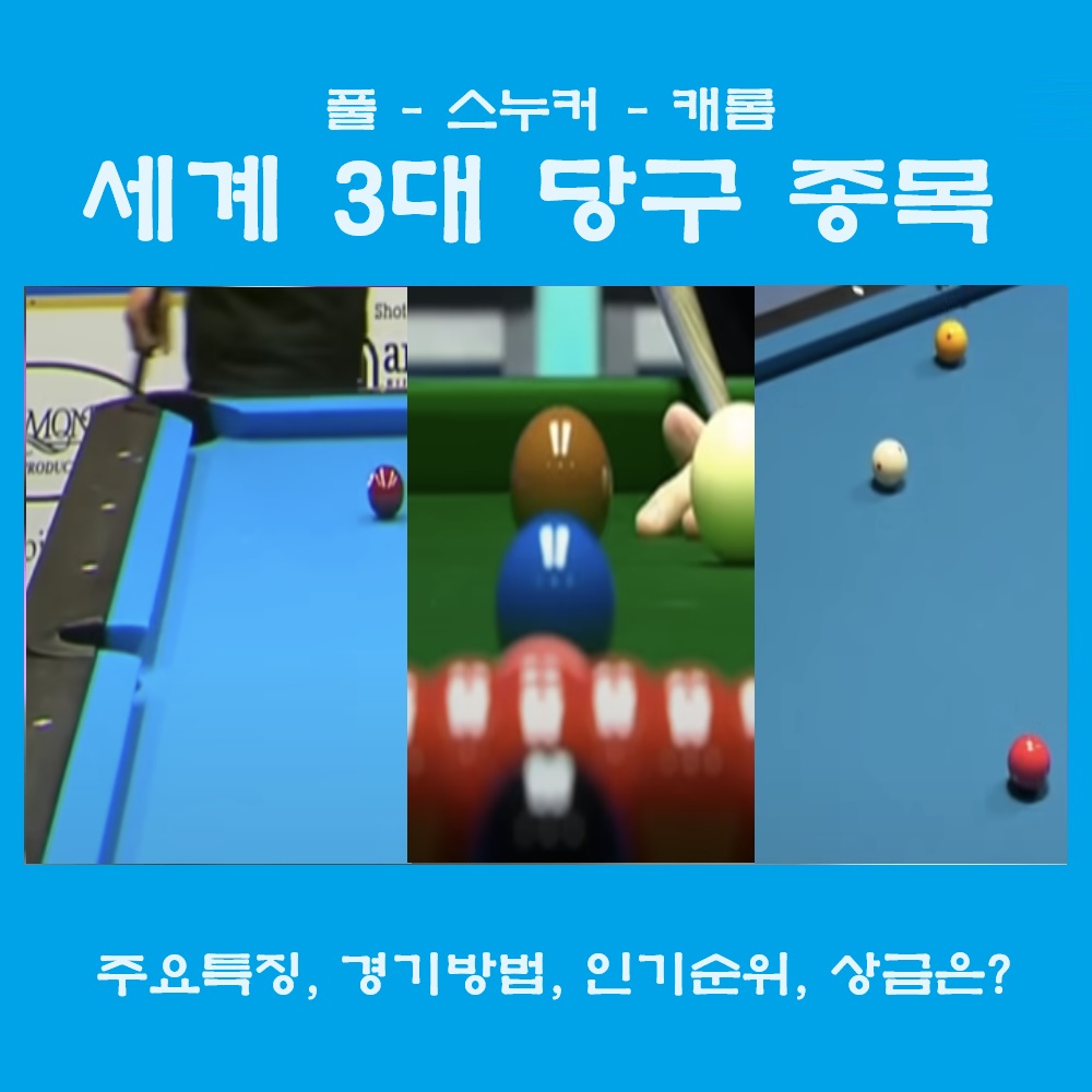 당구에 진심인 당구팬들을 위한 당구정보입니다. 오늘은 동네 당구의 시선에서 잠시 벗어나, 전 세계인들이 즐기는 3대 당구 종목 스누커, 풀(포켓볼), 캐롬의 개요 및 특징, 경기 및 득점 방법 정보를 정리해 보았습니다. 정리하다 보니, 제가 몰랐던 당구 지식도 제법 알게 되었습니다.