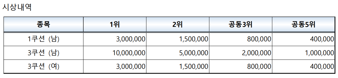 한편 제12회 아시아 캐롬선수권대회 시상금(우승, 준우승, 공동 3위, 공동 5위 상금)은 위의 표와 같습니다. 남자 3쿠션 종목은 우승 상금 1천만원으로 가장 많으며, 여자 3쿠션과 남자 1쿠션은 우승 상금 3백만원입니다.