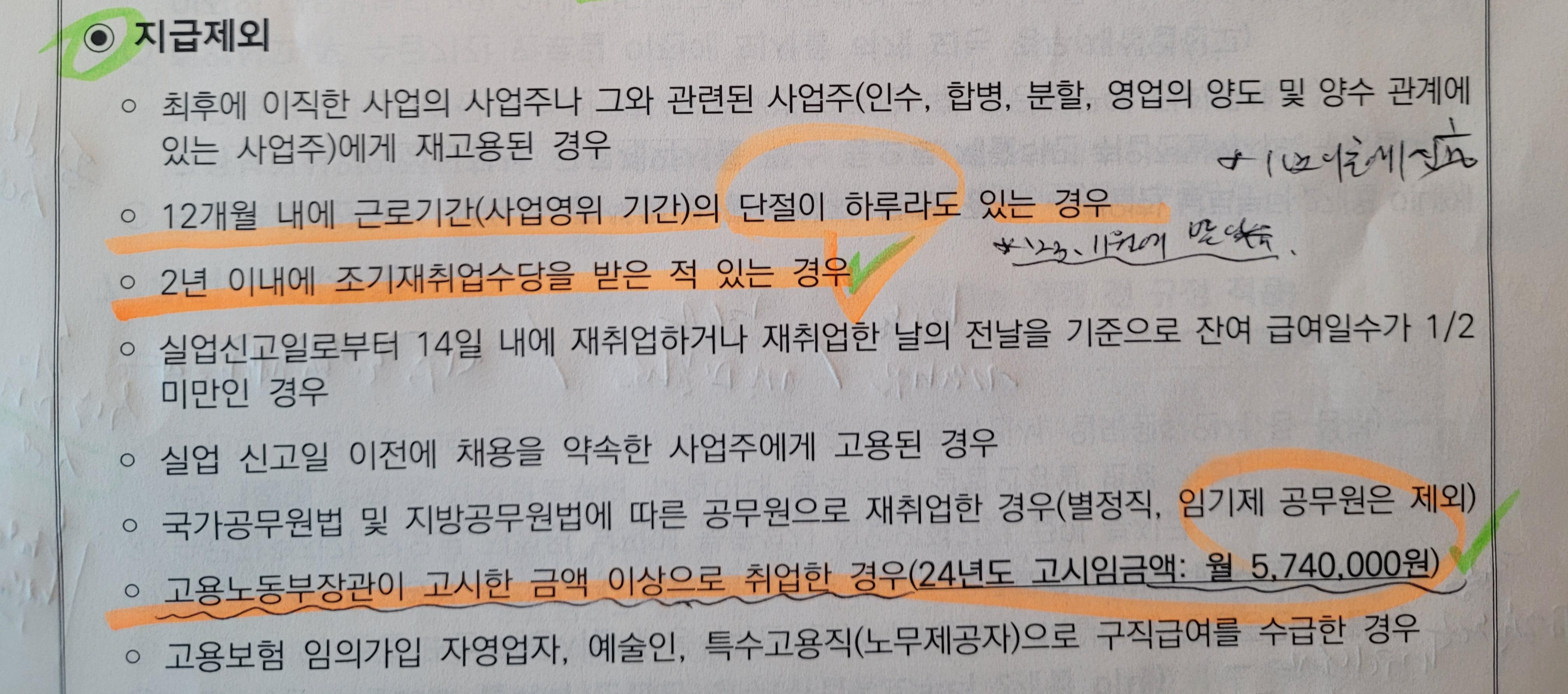 7) 고용노동부장이 고시한 금액 이상으로 취업한 경우에도 조기재취업수당 지급을 받을 수 없습니다. 2024년 고용노동부장관 고시임금액은 월 574만원입니다.