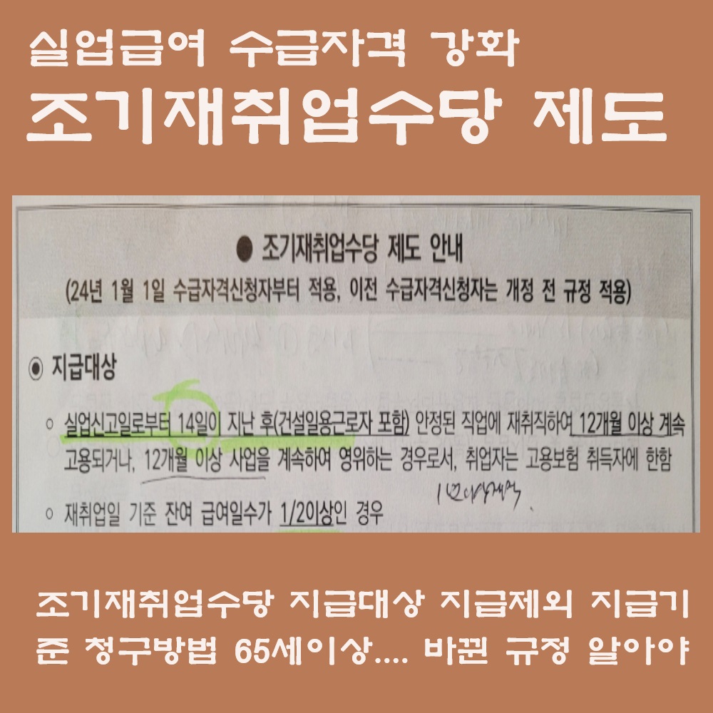 이유는 뉴스에서도 많이 회자되었듯이 국가의 실업급여를 교묘하게 악이용 하여 수령하는 분들이 많아지고 있어 국가에서도 실업급여 제도와 정책을 강화하고 있습니다. 이에따라 조기재취업수당을 지급하는 제도와 정책은 2024년 1월 1일부터 상당히 강화하였습니다.