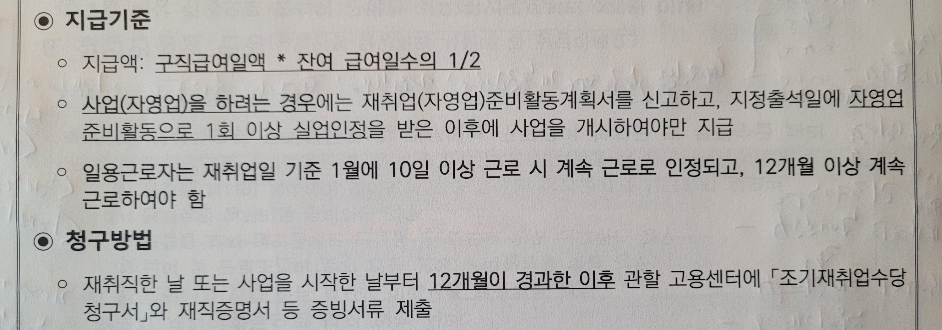 4) 실업 신고일로부터 14일 내에 재취업하고나 재취업한 날의 전날을 기준으로 잔여 급여일수가 1/2 미만인 경우에는 조기재취업수당 지급을 받을 수 없습니다.
