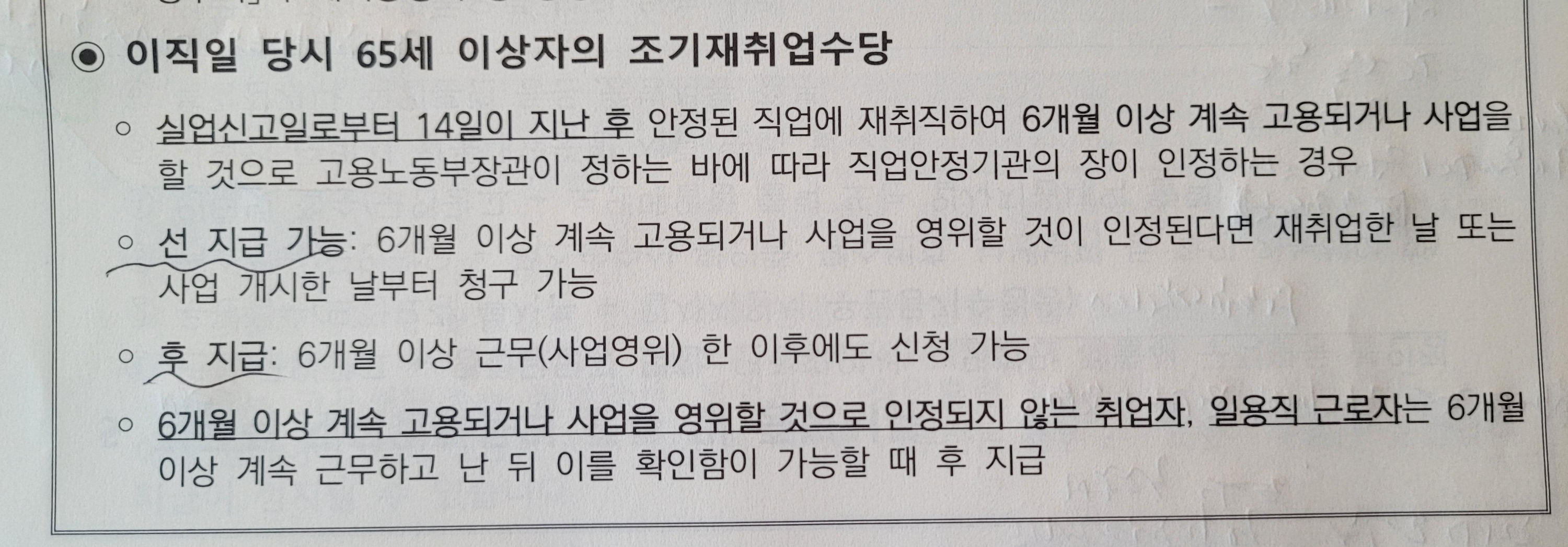 이직일 당시 65세 이상자의 조기재취업수당입니다. 실업신고일로부터 14일이 지난 후, 안정된 직업에 재취직하여 6개월 이상 계속 고용되거나 사업할 것으로 고용노동부장관리 정하는 바에 따라 직업안정기관의 장이 인정하는 경우에 받을 수 있습니다.
