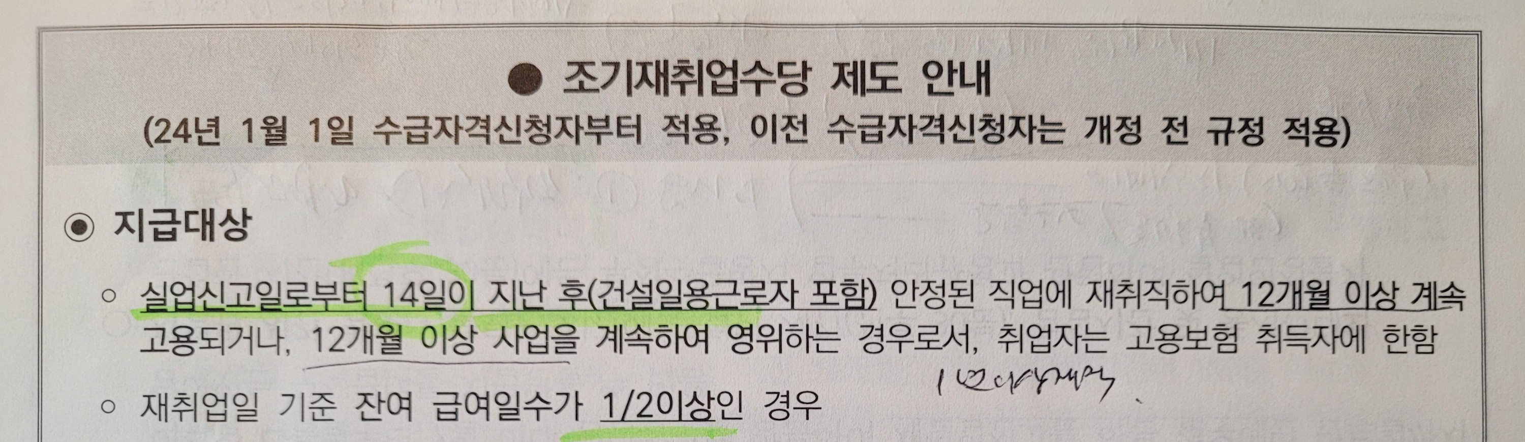 조기재취업수당 지급대상은 실업신고일로부터 14일이 지난 후(건설일용근로자 포함) 안정된 직업에 재취직을 하여 12개월(1년) 이상 계속 고용되고나, 12개월 이상 사업을 계속하여 영위하는 경우로서, 취업자는 고용보험 취득자에 한합니다. 또한 재취업일 기준 잔여 급여일수가 절반(1/2) 이상 남아있어야 합니다.