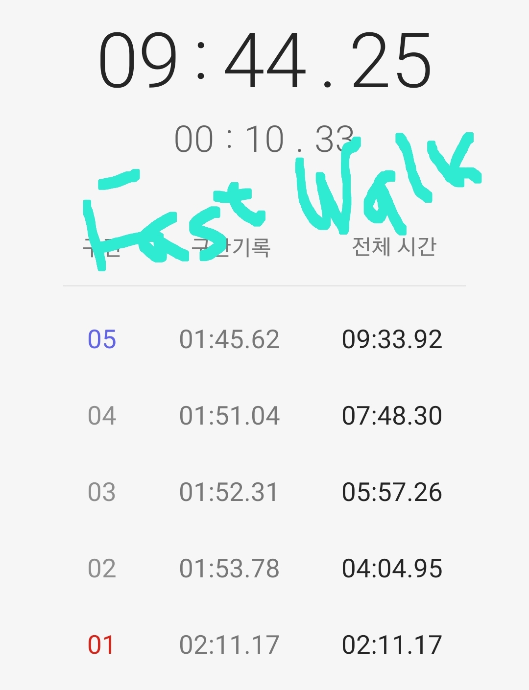 5. 5월 25일 저녁, 빠르게 걷기 2분 10초 ~ 1분 45초, 5세트