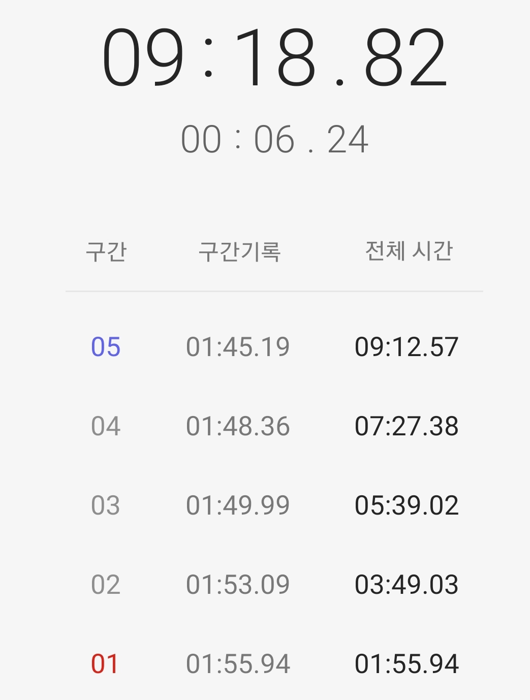 총시간은 9분 14초로 다섯 세트를 실기하였습니다. 구간 기록은 1세트를 1분 55초에 시작하여 2 ~ 4초 정도 조금씩 줄어들었습니다. 물론 마지막 5세트는 어느 정도 기록을 단출할 수 있나를 체크하기 위하여 두 팔의 팔뚝을 허리 위로 붙이면서 조금 속도를 높여보았습니다.